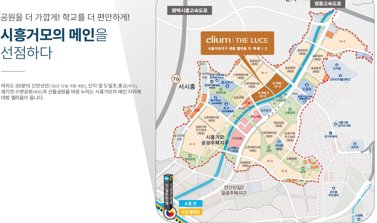 ※ 상기 토지이용계획도의 학교·행정기관·공공 공지·기타 등 예정된 각 부지의 토지이용계획은 시흥거모지구 지정 변경(3차) 승인(국토부 고시 제2024-826호)를 참고하였으며 추후 관계기관 및 지자체의 계획 변경에 따라 용도 변경, 위치 이동, 연기, 변경, 취소될 수 있으므로 청약 및 계약 전 입주자모집공고 및 견본주택을 방문하시어 반드시 확인하시기 바랍니다.